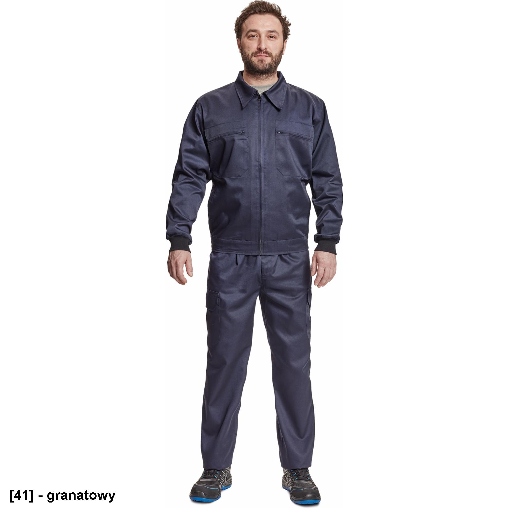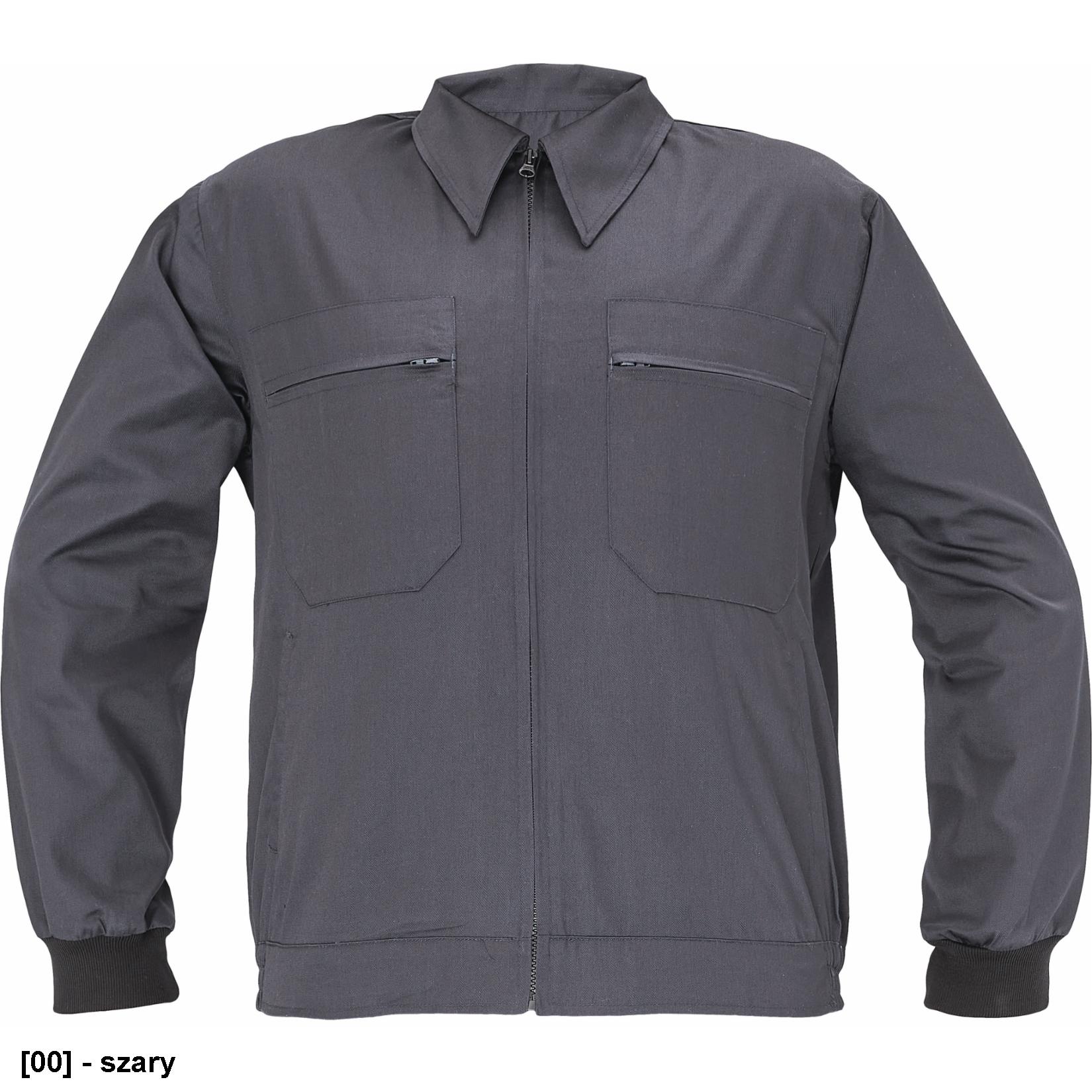męska kurtka robocza; 2 kieszenie napiersiowe zapinane na suwak; 2 kieszenie boczne; elastyczne mankiety; 20 % bawełna + 80 % polyester
