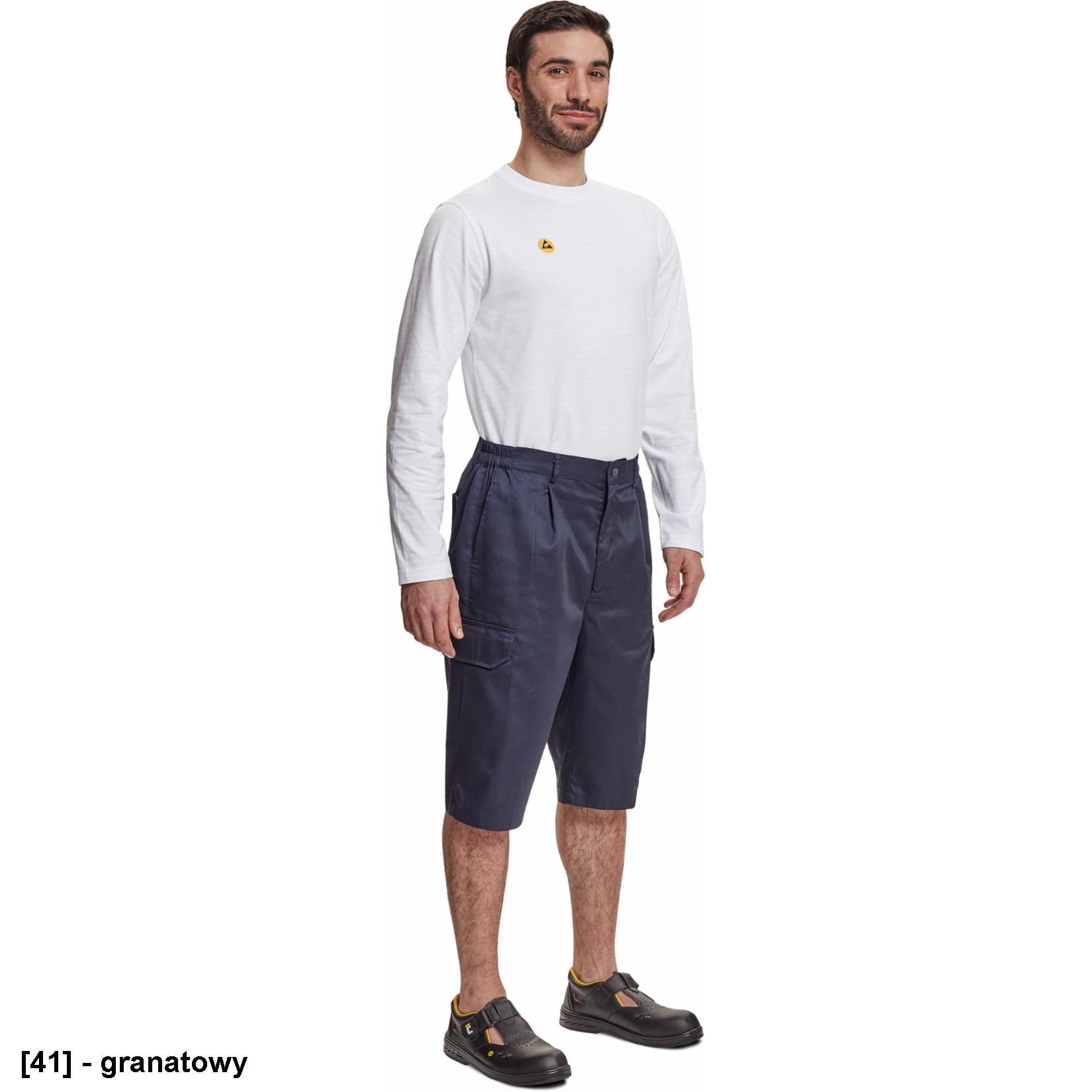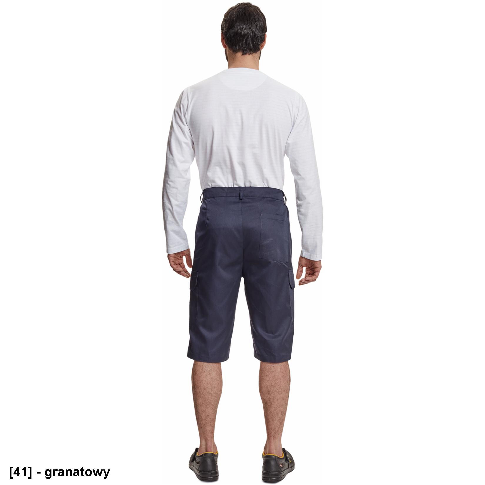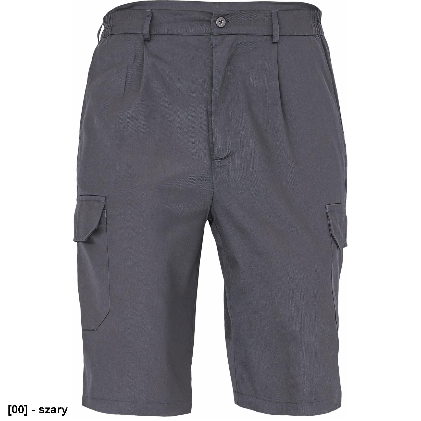 męskie szorty robocze z elastyczną talią; 2 kieszenie boczne; 2 kieszenie udowe z patką, zapinane na rzep; 1 kieszeń tylna z zapięciem na rzep; 20 % bawełna + 80 % polyester