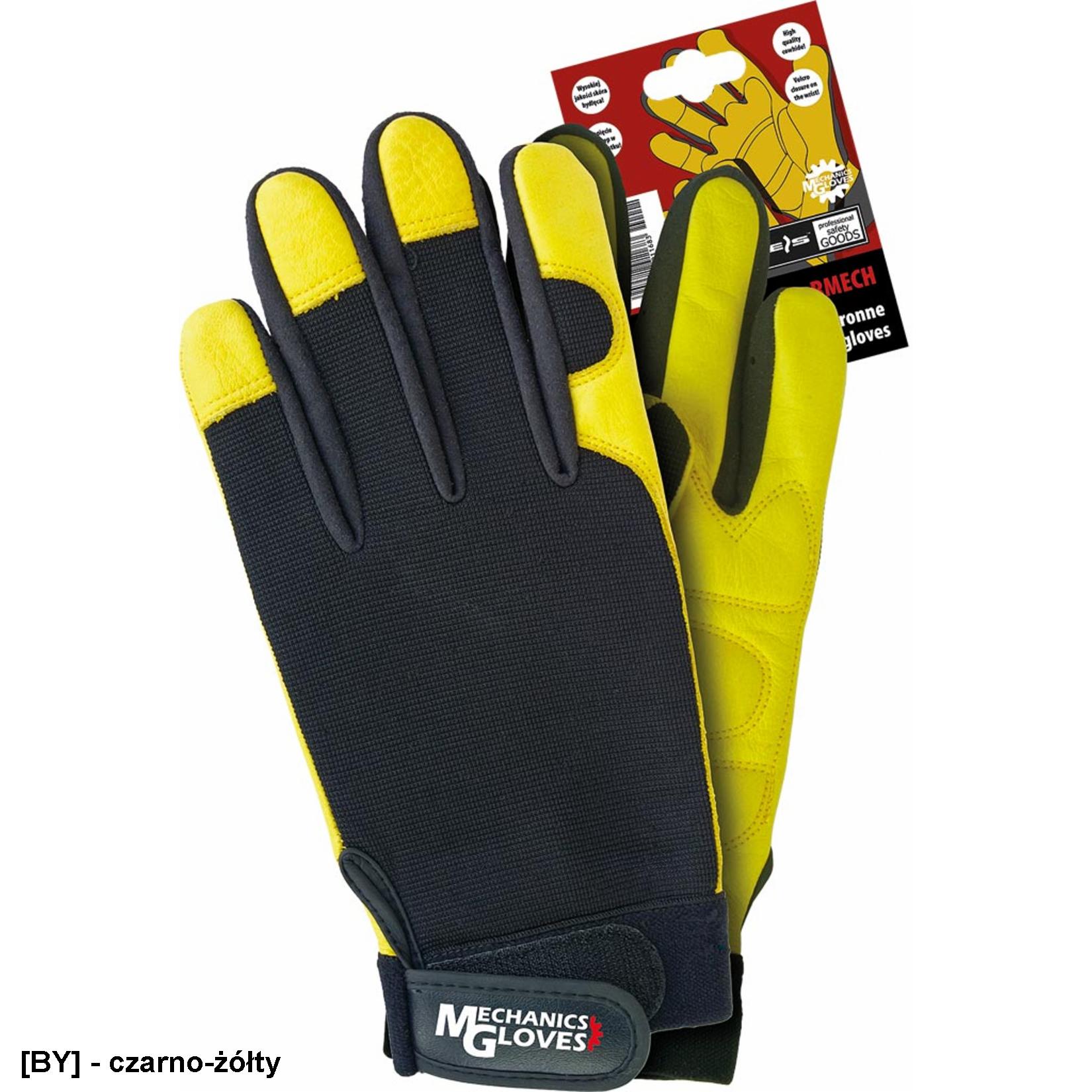 - Rękawice ochronne wykonane z wysokiej jakości skóry bydlęcej połączonej z czarną tkaniną. na części chwytnej miękka skóra licowa w żółtym kolorze.