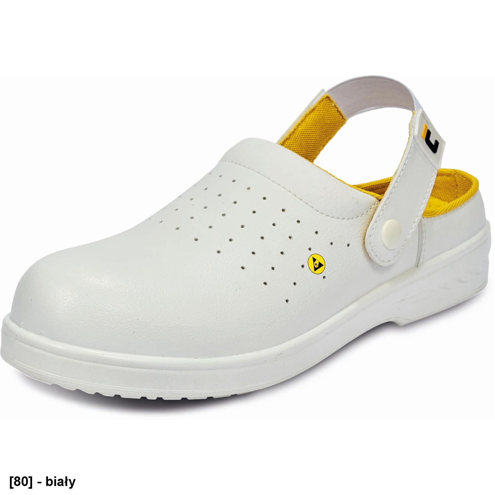 Bezpieczne sandały ESD z paskiem przez piętę z materiału syntetycznego o wysokiej mikroporowatości, przyszwą z mikrowłókna, kompozytowym usztywnieniem noska, podeszwą PU odporną na oleje i z lepszymi parametrami przeciwpoślizgowymi.
