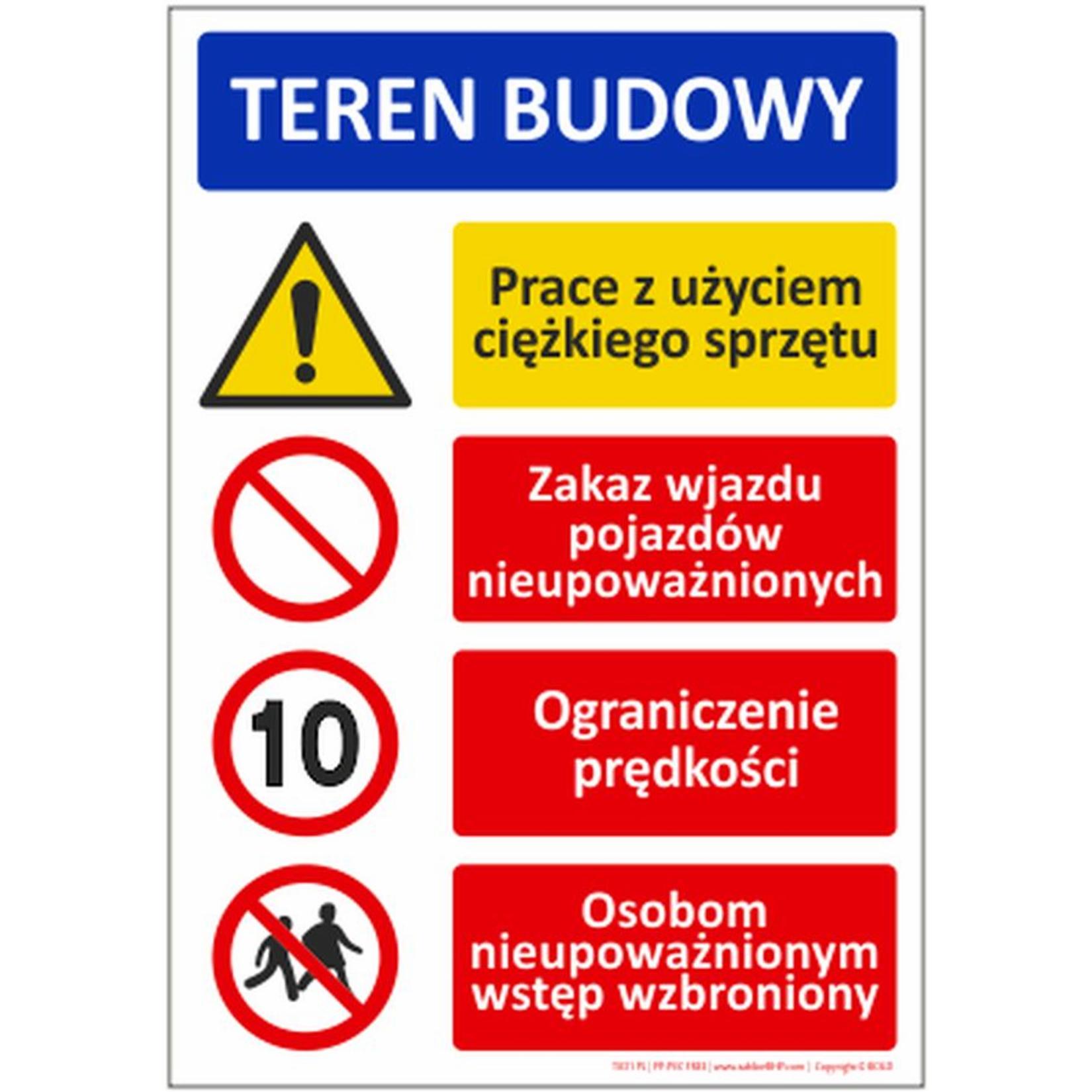 Tablica do zastosowania na terenie budowy lub obiektu przemysłowego mająca na celu w łatwy i czytelny sposób przekazanie informacji o obowiązkach i zagrożeniach podczas przebywania na oznakowanym terenie.