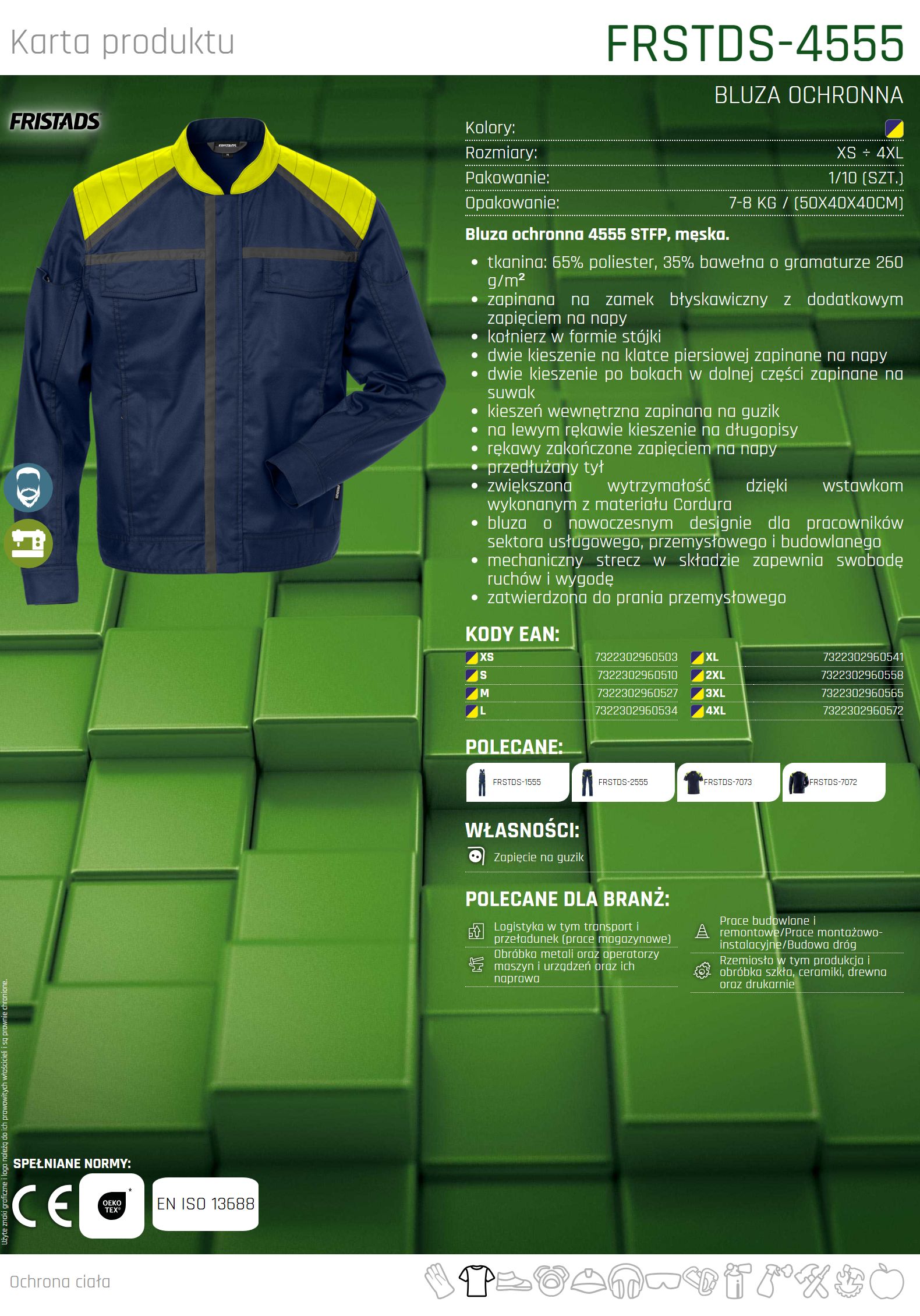 - Bluza ochronna 4555 stfp, męska. tkanina: 65% poliester, 35% bawełna o gramaturze 260 g/m2.