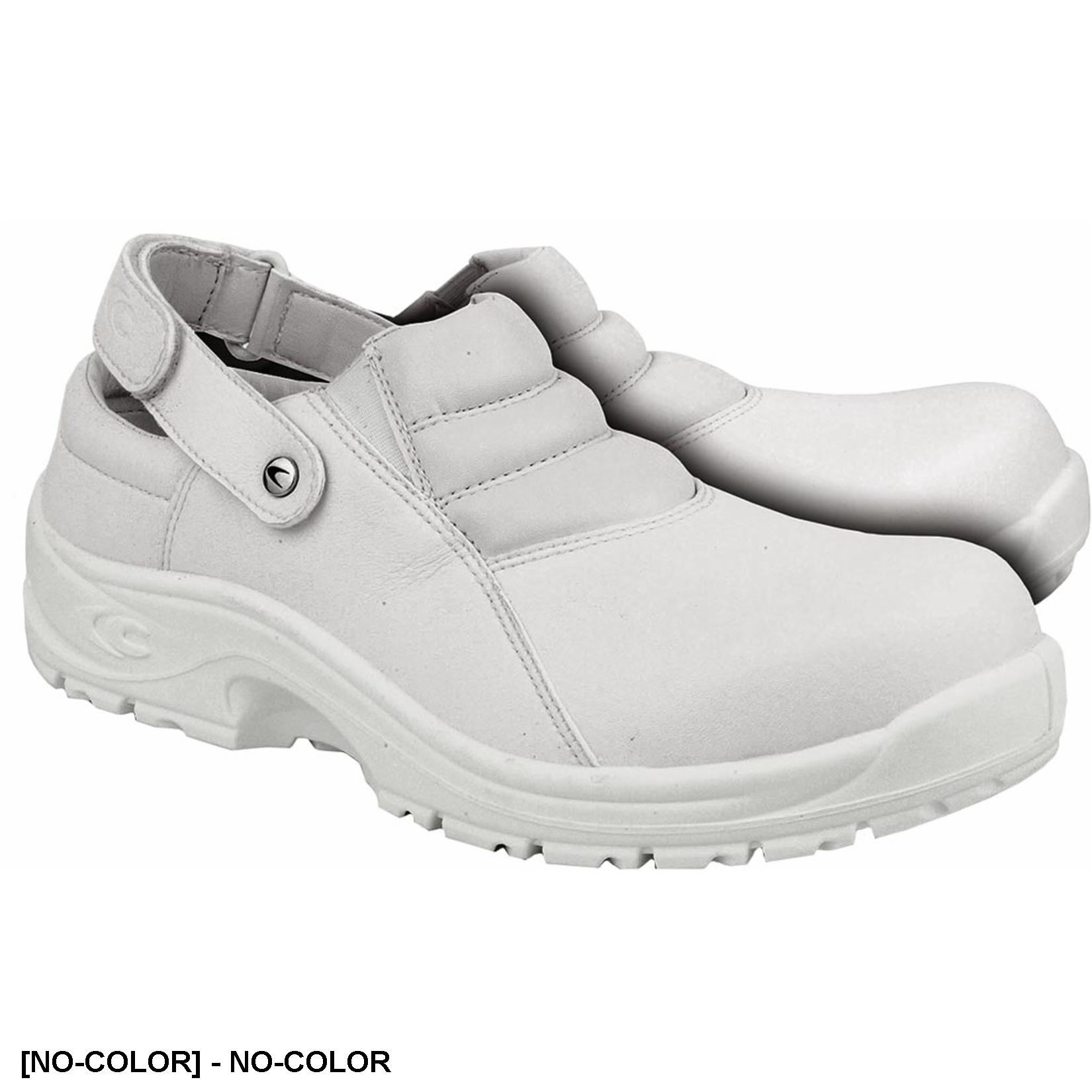 Białe półbuty z częściowo zabudowaną piętą oraz regulowanym paskiem.