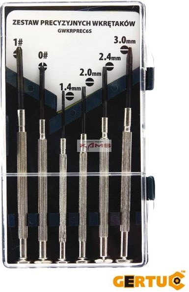 Zestaw zawiera 6 elementów: zakończenie płaskie 1.4 mm, 2.0 mm, 2.4 mm, 3.00 mm oraz krzyżowe Philips 0#, 1#.